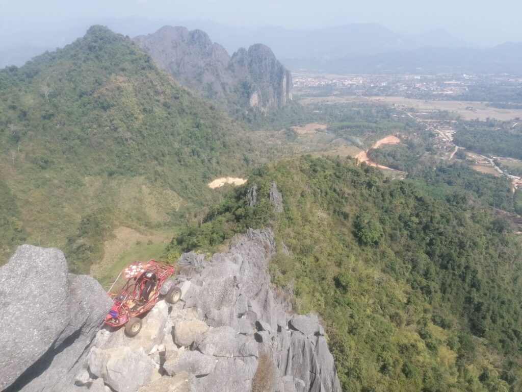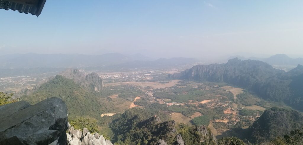 Also stand ich kurze Zeit später wieder an der Straße und brauchte einen neuen Plan. Auf Google Maps fand ich ein paar Meter weiter den Startpunkt für einen anderen Aussichtspunkt. Klingt machbar, dachte ich und machte mich auf den Weg. Ich bezahlte ’n Euro Eintritt, kaufte noch ein (für Laos Verhältnisse) überteuertes Wasser und begann zu kraxeln. Diesmal ging’s nämlich auch tatsächlich Berg auf. Nach guten 45 Minuten war ich am ersten View Point.