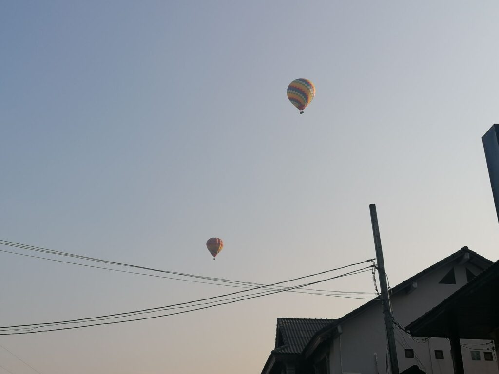 Dann bin ich wieder runter gegangen. Ich finde immer ein Aufstieg braucht Kraft und ein Abstieg Konzentration. Hier vor allem Konzentration darauf, dass man auf dem Sandboden nicht weg rutscht und mies hinfällt. Natürlich ist es trotzdem auch körperlich anstrengend, wirklich, meine Beine haben sich angefühlt wie Pudding und ich bin diesen Berg basically einfach nur runtergeschwabbelt. Beim Abstieg habe ich ein paar nette, erschöpfte Laotianer getroffen die mich gefragt haben wie weit es noch ist. „Nicht weit“ hab ich gesagt, „Ihr schafft das!“. Ganz unten habe ich nochmal einen Laotianer getroffen, der konnte kein Englisch, aber er hat mir Orangen geschenkt. Gut genährt und mit 23.000 Schritten auf dem Schrittkonto konnte ich nun den Rückweg antreten. Nocheinmal gute 45 Minuten bis zum Hostel zurück. Machbar. Aber kaum hatte ich den Ticketschalter vom Aussichtspunkt hinter mir gelassen, kam ein Vietnamese auf ’nem Moped vorbei und bot an mich in die Stadt zurück zu fahren. Da sagt man natürlich nicht nein. Also konnte ich das Ende meines Wanderausflugs entspannt auf einem fahrbaren Untersatz genießen und die Heißluftballons beobachten die in den Sonnenuntergang aufstiegen.